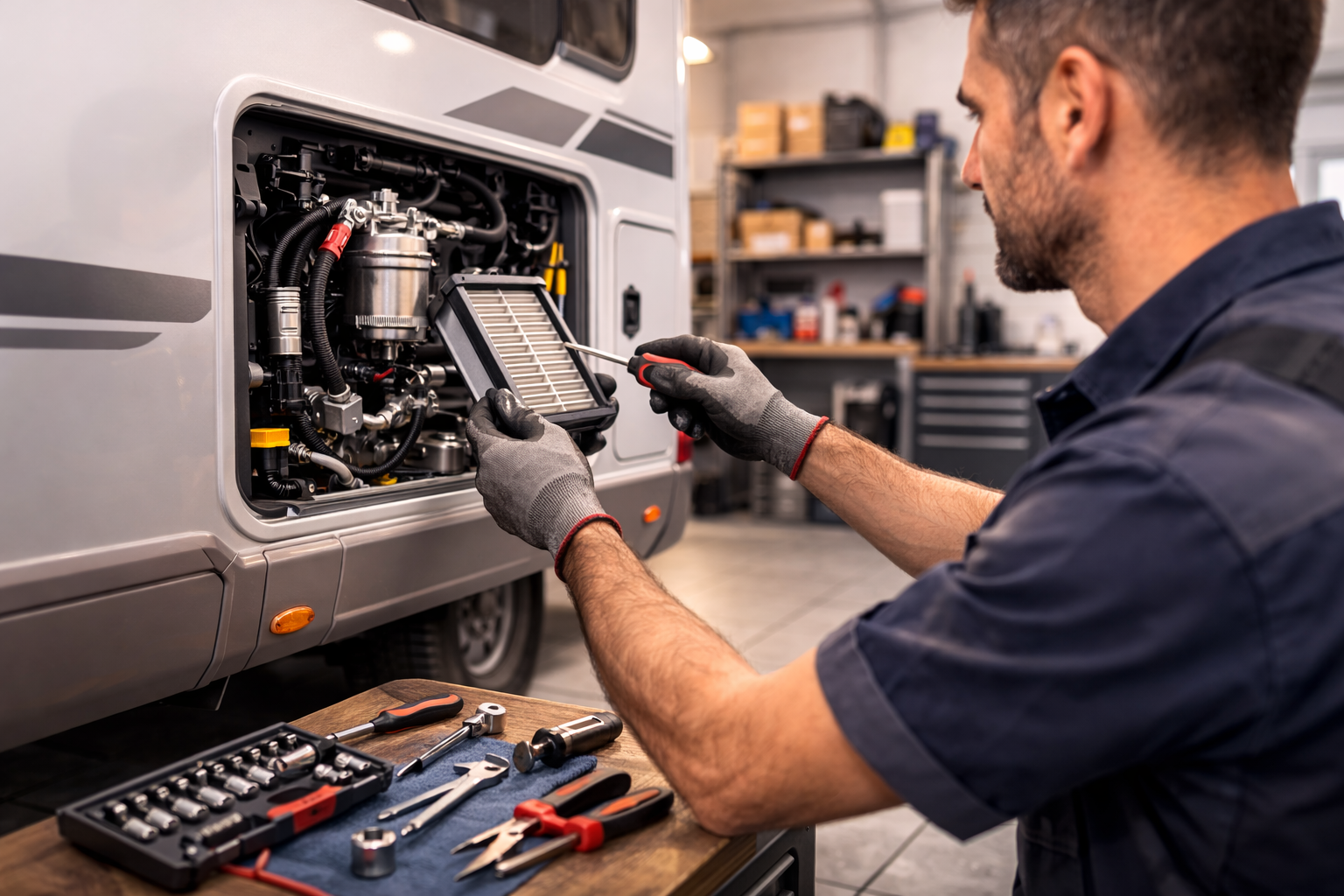 Réparation et remplacement de pièce détachée sur camping-car par un technicien spécialisé.